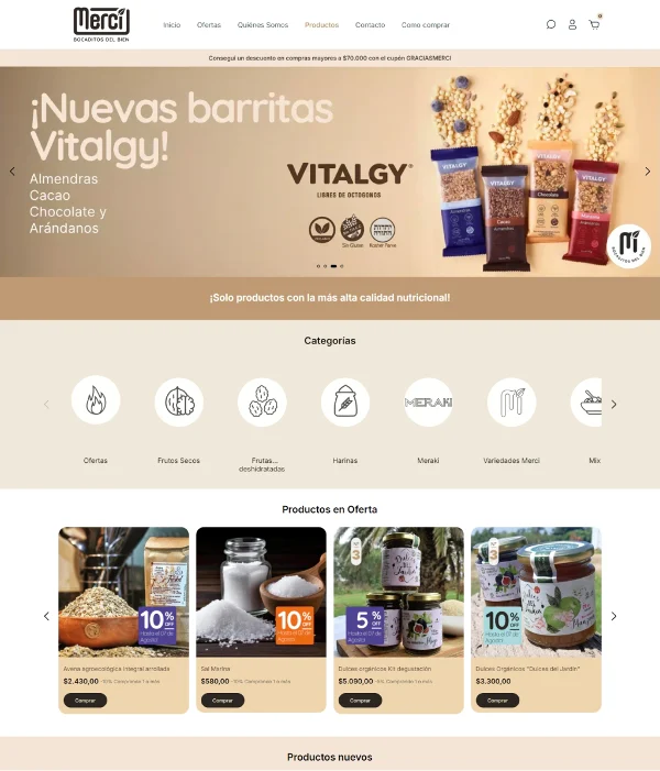 Esta es una tienda de productos naturales de alta calidad nutricional que fue previamente creada en tiendanube.com por el cliente. Mi trabajo fue el de diseñar la web y aplicar la indentidad visual. Además manejo mensualmente todo el marketing y promociones en conjunto con el equipo de redes sociales. Hay un especial cuidado en las fotografías y en toda la identidad para generar esa sensación de productos nobles.